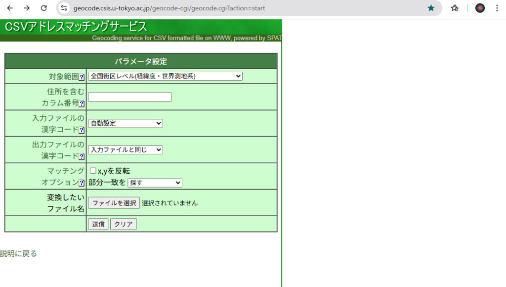 ふたつめに紹介するのは東京大学が公開しているcsvアドレスマッチングサービスです。