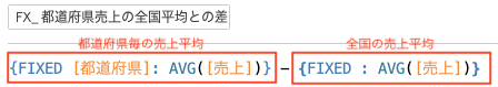 計算フィールドで都道府県毎の売上平均と全国の売上平均との差を計算する式を定義して、「FX_都道府県売上の全国平均との差」という名称で作成します。